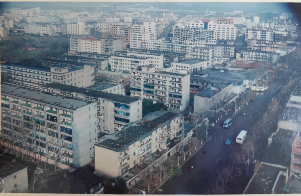 ▲80年代末,荊門市長寧大道街景圖。荊門公交集團(tuán)總公司(舊址)位于長寧大道西側(cè)。當(dāng)年總公司院內(nèi)建有辦公樓、停車場(chǎng)、機(jī)修車間、機(jī)加車間、油庫、倉庫。