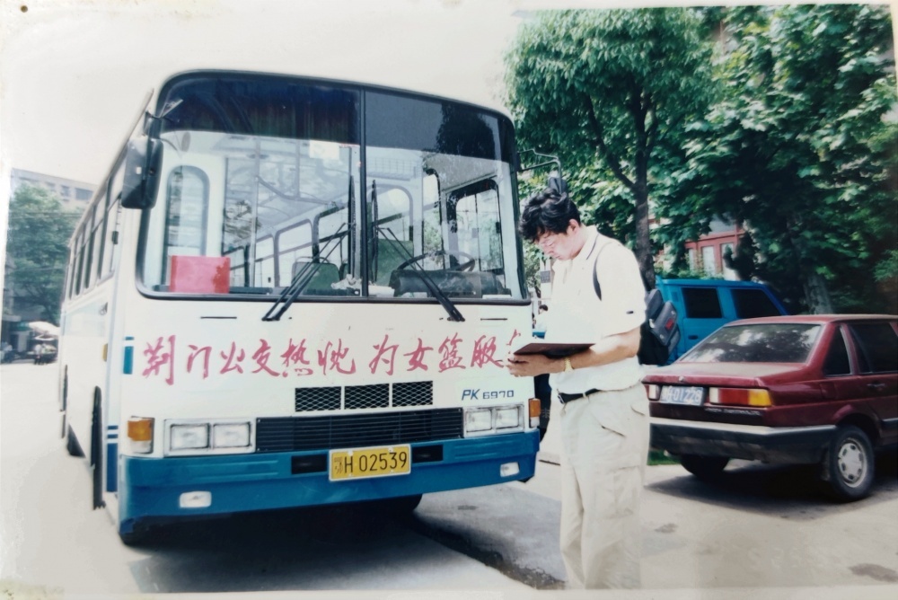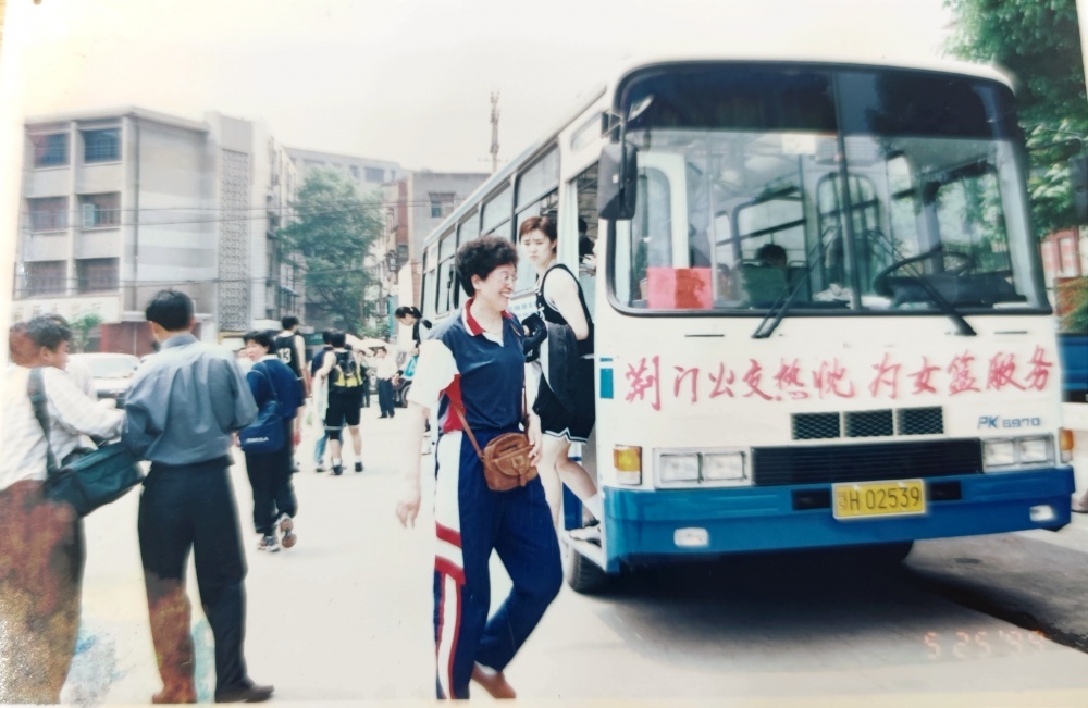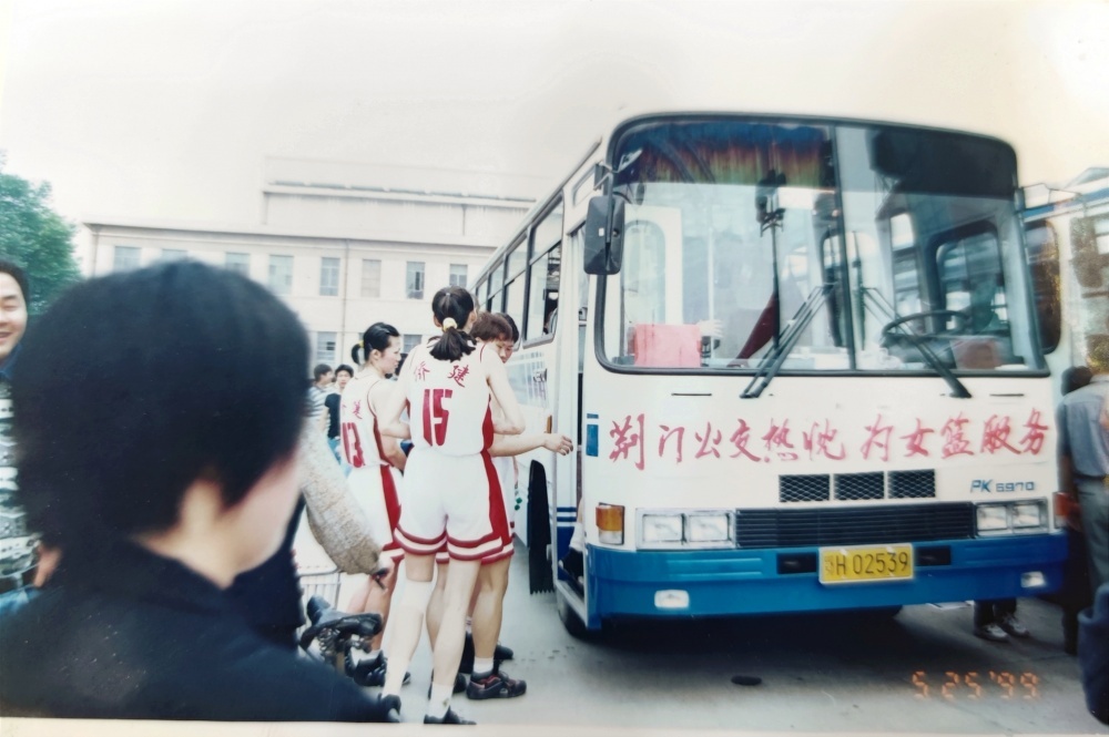 ▲1999年5月25日,沈陽電梯隊隊員、教練乘坐公交出行。公交車頭還掛有“荊門公交熱忱為女籃服務(wù)”橫幅。