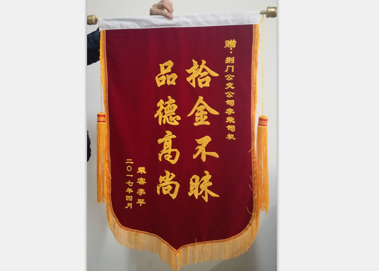 2017年4月4日上午九點左右,一名乘客由于粗心大意,不慎將一個包包遺留在公交車內(nèi),包包內(nèi)裝有蘋果平板電腦一個、手機(jī)一部、金銀手飾一包、銀行卡數(shù)張、身份證、現(xiàn)金若干.......二公司三路車159#駕駛員李榮在到達(dá)運(yùn)動公園始發(fā)站打掃衛(wèi)生時發(fā)現(xiàn)了一個紅色包包,該駕駛員立馬與隊長取得聯(lián)系、剛好隊長和站務(wù)在始發(fā)站,駕駛員李榮親自將包交給了隊長,并說明原由,并在眾人下隊長打開了包包,發(fā)現(xiàn)里面的都是貴重物品。不久,失主打包內(nèi)的電話來詢問此事,隊長認(rèn)真做了回復(fù),告之為保證物品安全,要攜帶證明按程序認(rèn)領(lǐng)。當(dāng)天下午失主李女土從公司支部書記手中認(rèn)領(lǐng)失物。昨日送來錦旗一面。