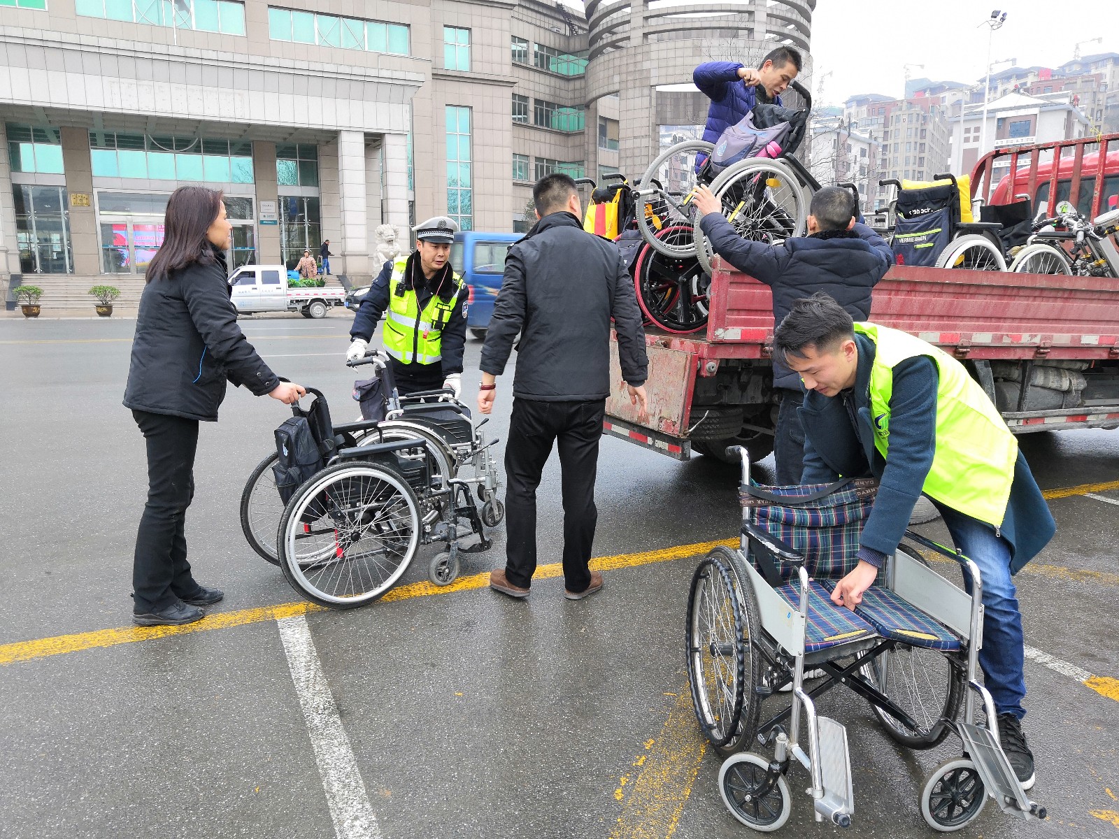 20輛雷鋒車整齊列隊停靠,25名輪椅人5名盲人朋友在雷鋒的哥和公交志愿者的協(xié)助下安全乘上車,輪椅車統(tǒng)一集中搬運,開始下一階段活動,陪殘疾朋友游玩龍泉公園。