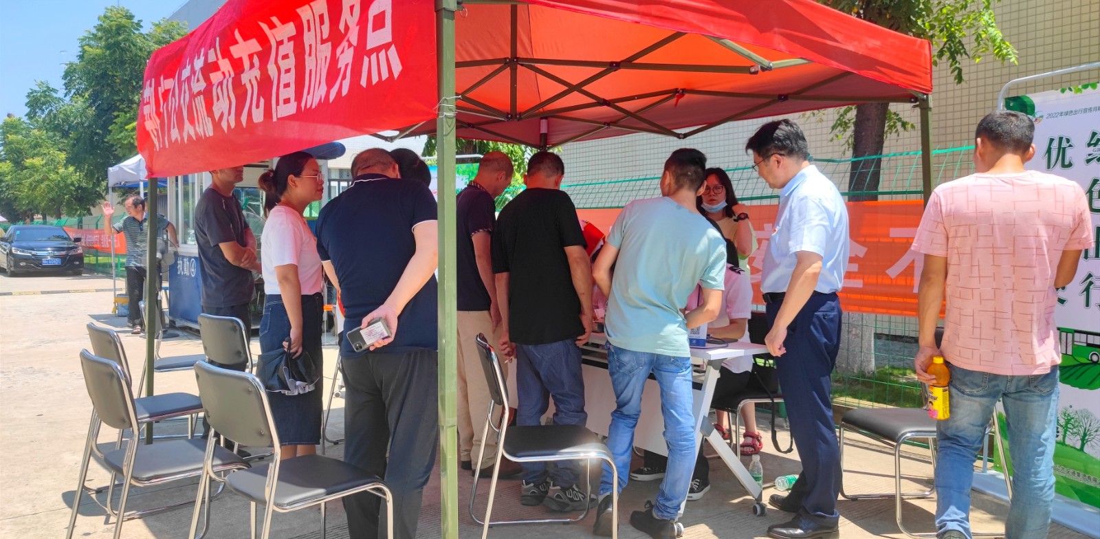 當(dāng)天中午12時(shí),正是一天最炎熱的時(shí)候,也是廠區(qū)職工午休時(shí)間。選在這個(gè)時(shí)間段開展流動(dòng)服務(wù),是可以最大程度方便殘疾工友,不會(huì)耽擱到他們的生產(chǎn)作業(yè),更不會(huì)影響他們正常休息,服務(wù)點(diǎn)就設(shè)在他們下班的必經(jīng)路。